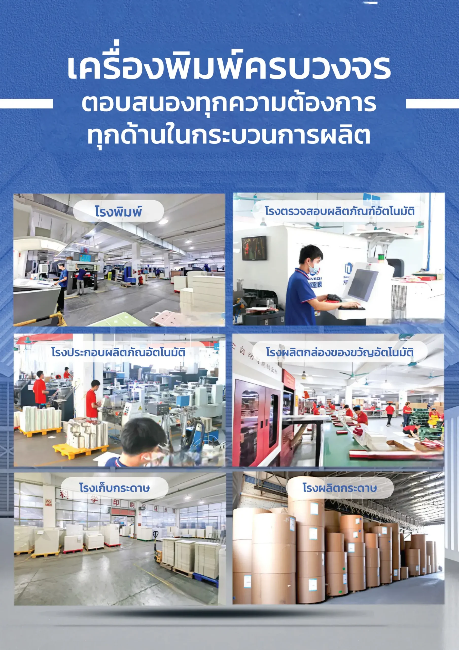 เราเป็นผู้เชี่ยวชาญในด้านการผลิตกล่องบรรจุภัณฑ์และกล่องของขวัญสำหรับทุกอุตสาหกรรม ด้วยพื้นที่โรงงานกว่า 25,000 ตารางเมตรซึ่งเป็นองค์กรบรรจุภัณฑ์ชั้นนำที่ครอบคลุมทั้งการออกแบบ การวิจัยและพัฒนาการพิมพ์ พร้อมให้บริการหลังการขายอย่างครบวงจร บริษัทของเรามุ่งเน้นให้บริการ แก่หลายอุตสาหกรรม ครอบคลุมทั้ง บรรจุภัณฑ์กระดาษ บรรจุภัณฑ์พลาสติก สำหรับเครื่องสำอาง ผลิตภัณฑ์เพื่อสุขภาพ อาหาร ยา และอุปกรณ์อิเล็กทรอนิกส์ รวมถึงบรรจุภัณฑ์ของขวัญ